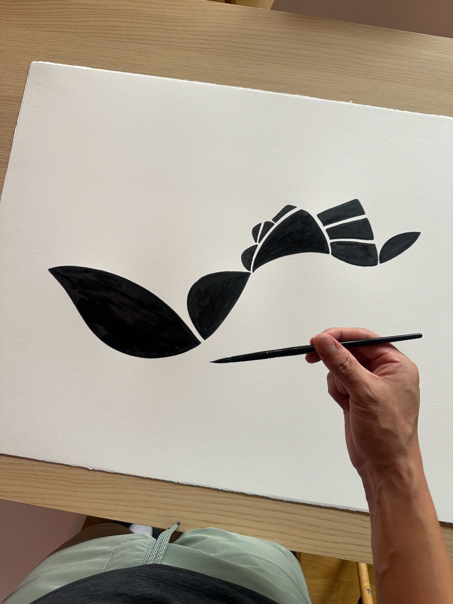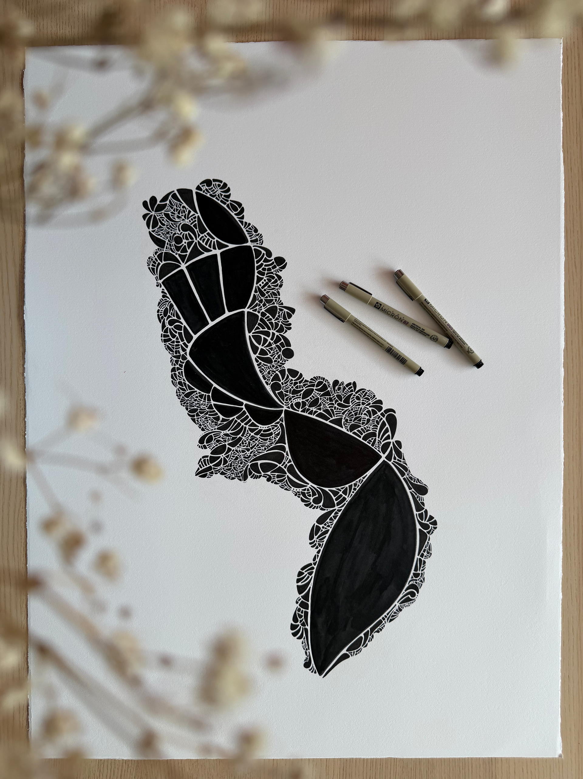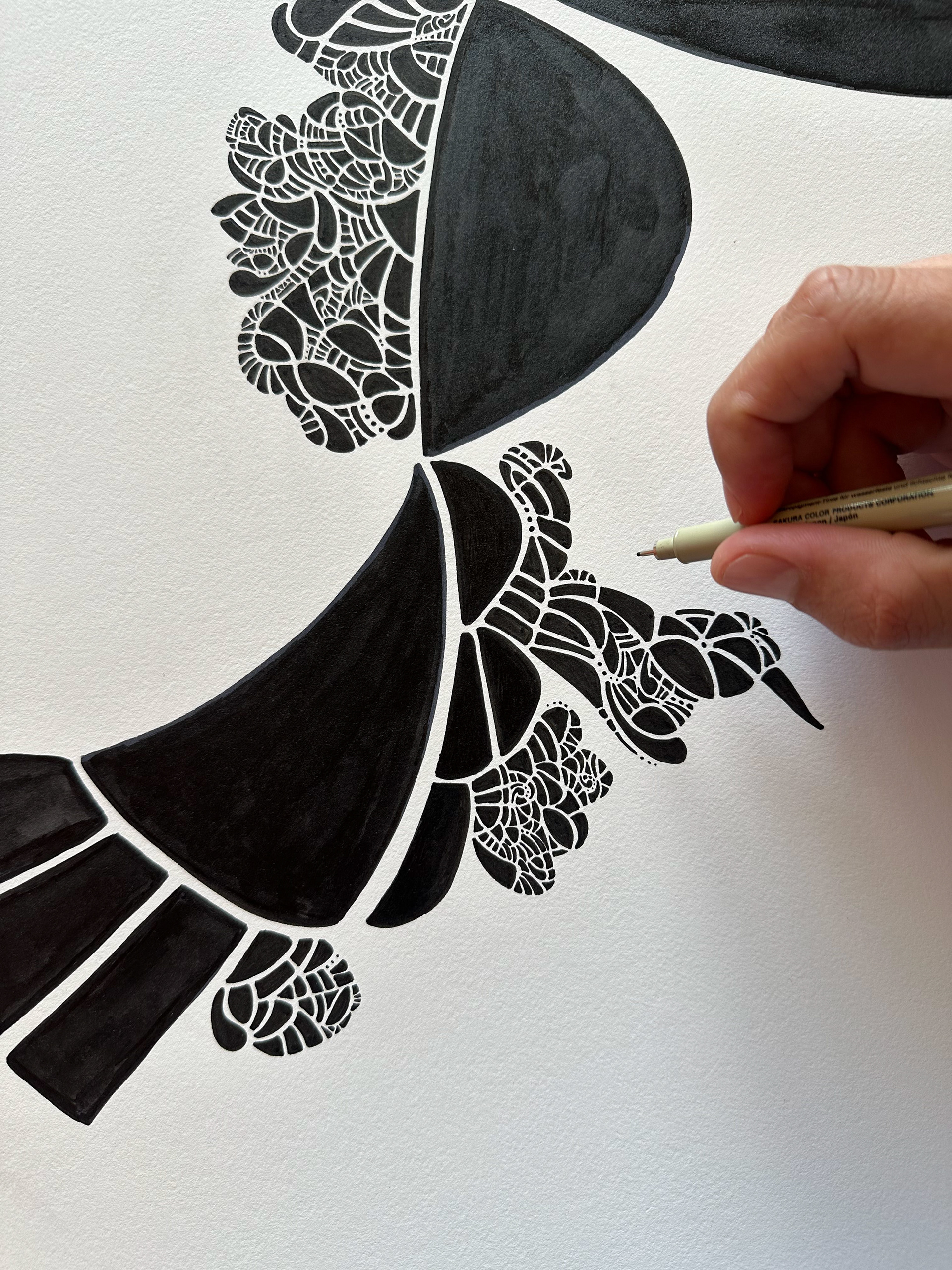 Noctil embodies the paradox of light within shadow. Its winding form suggests a current of emotion moving through the unseen layers of the self, anchored by dense, dark shapes yet threaded with intricate lines of possibility.
