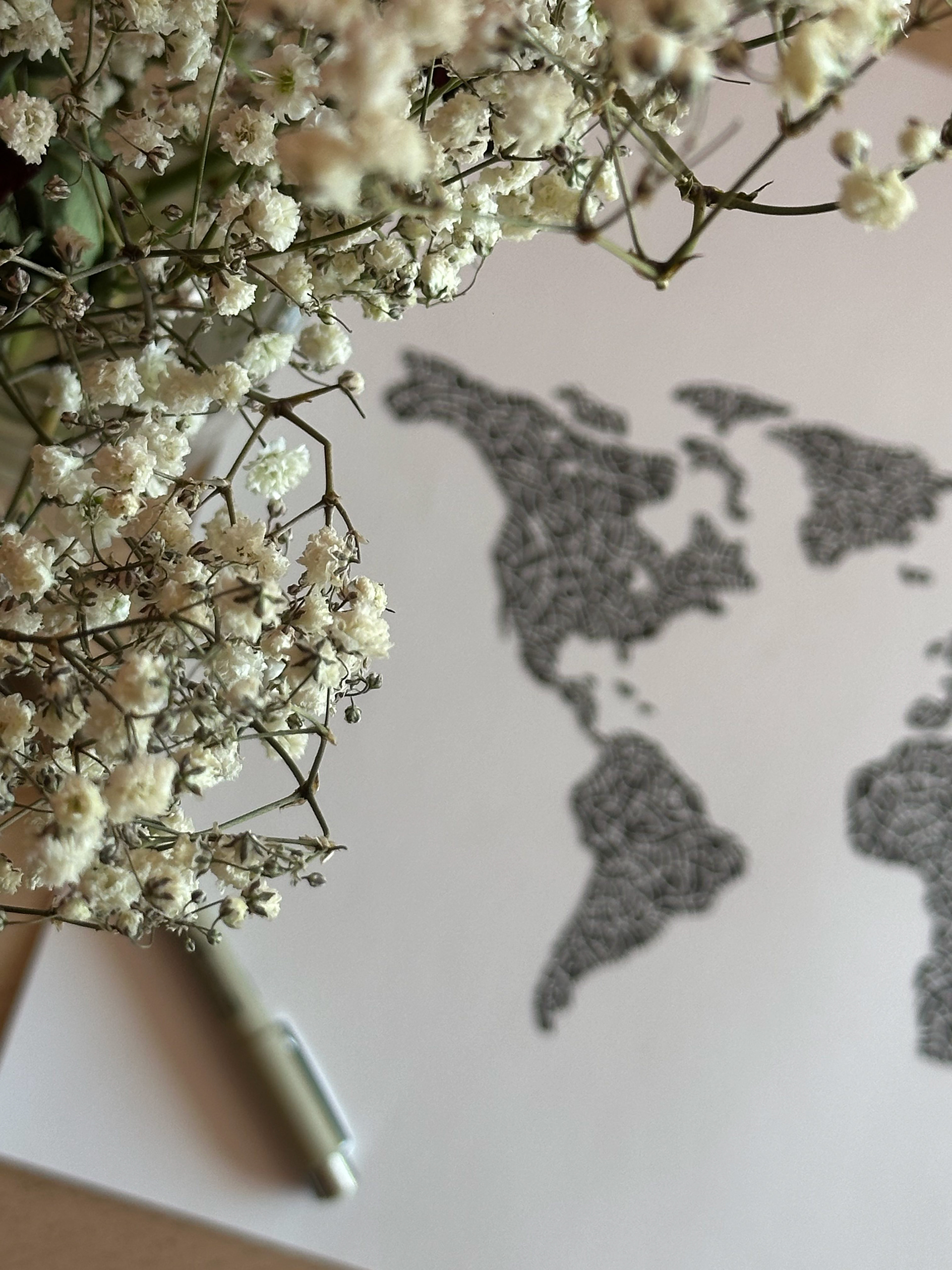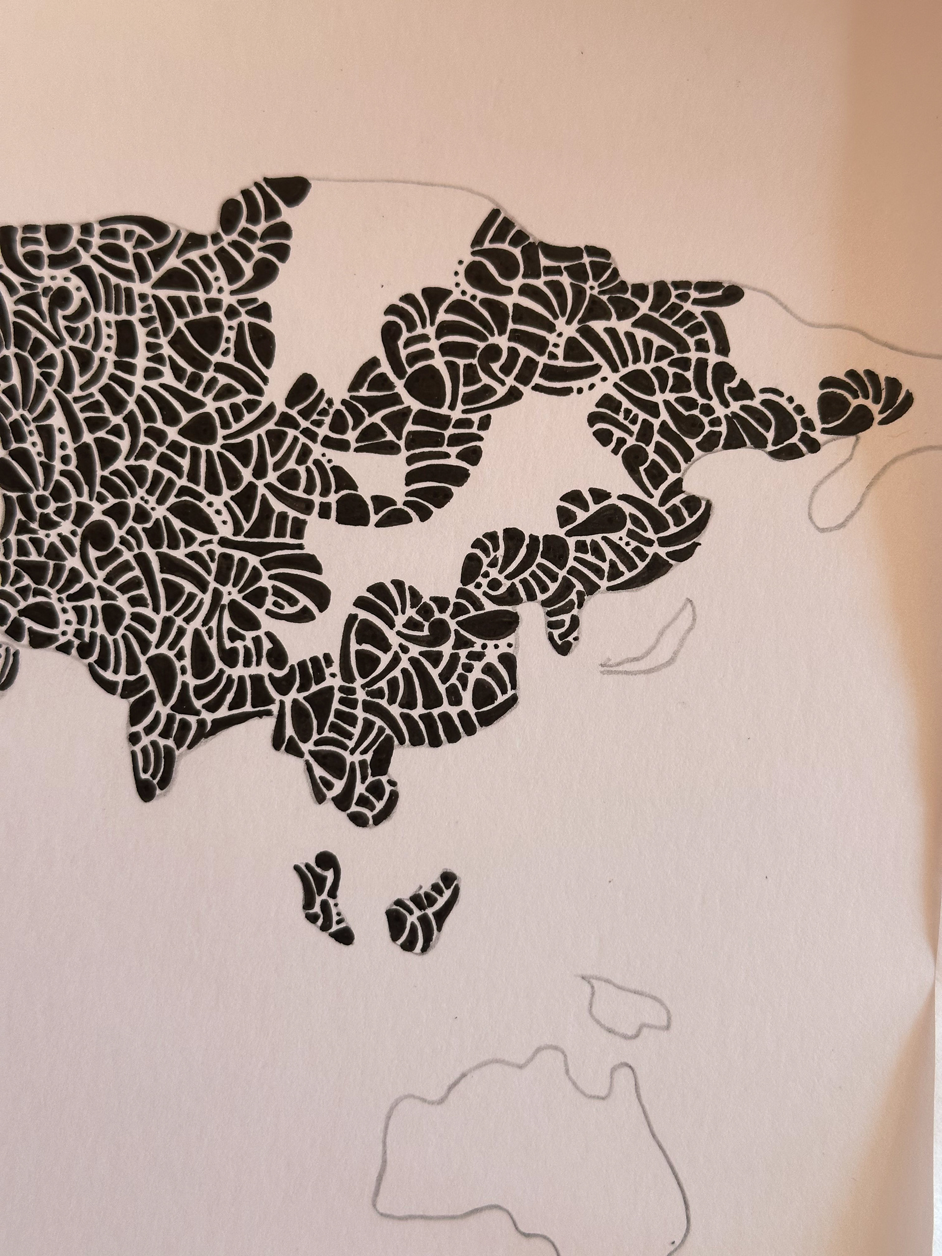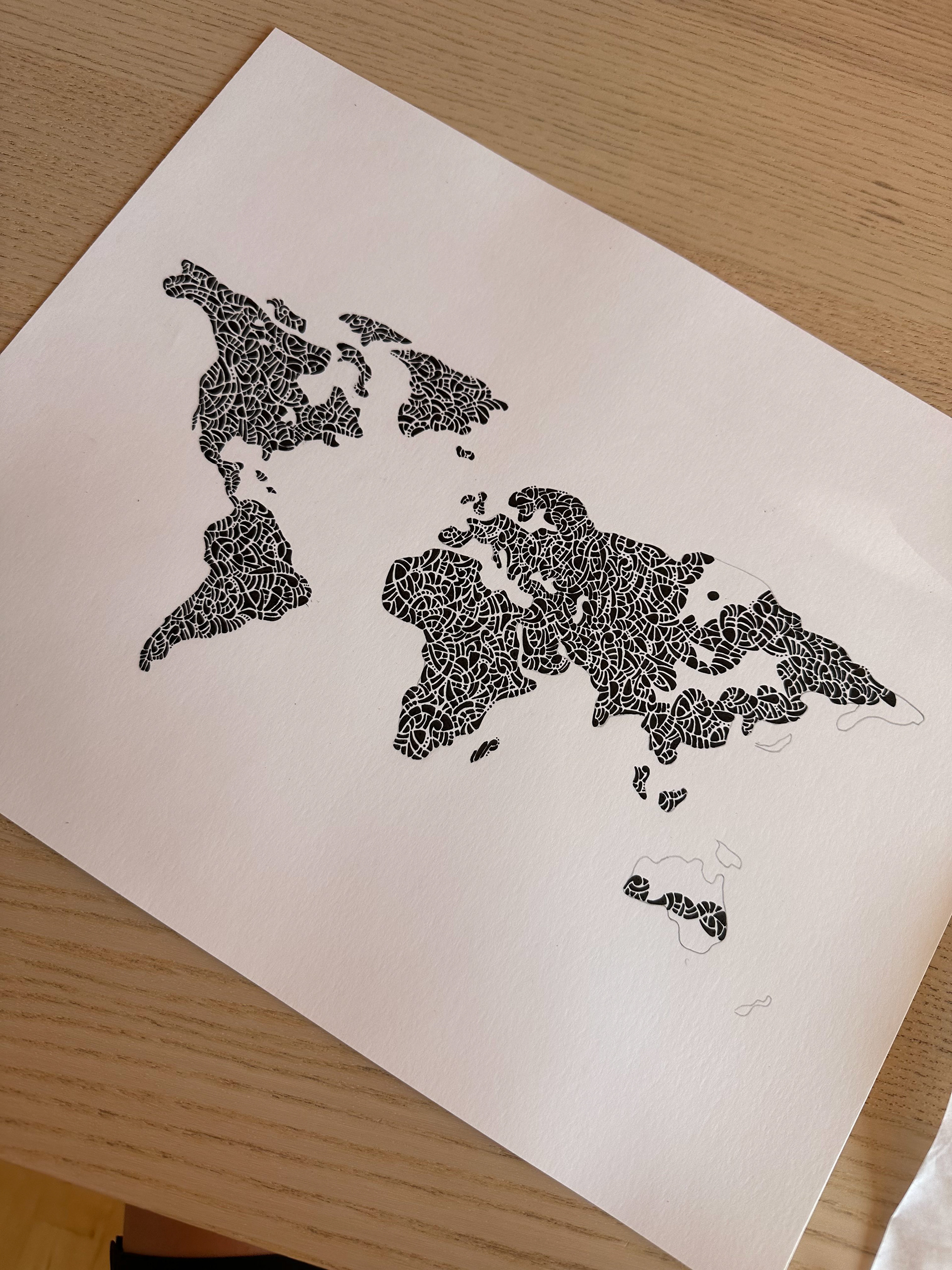 Abstract forms ripple across familiar contours, transforming the world into a network of patterns, movement, and energy. Each shape and detail evokes connection, rhythm, and the invisible forces that link places and people. The work is a meditation on scale and perspective, inviting reflection on the emotional currents that traverse borders, cultures, and landscapes, uniting the global and the intimate in a single visual experience.