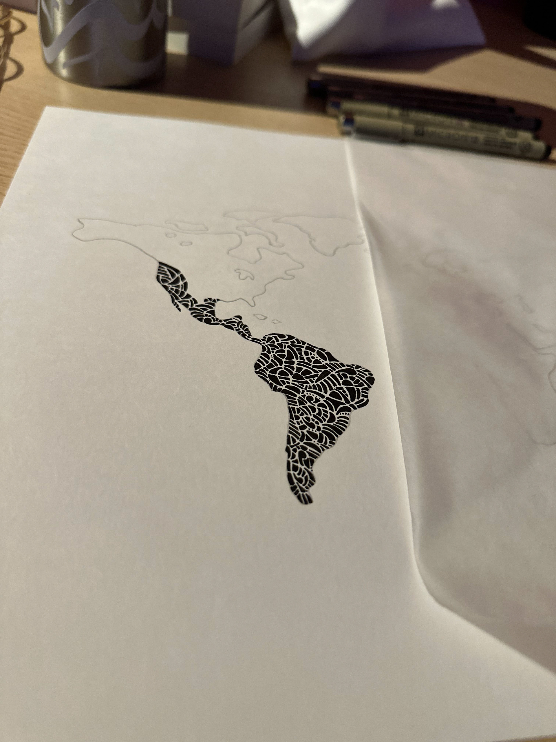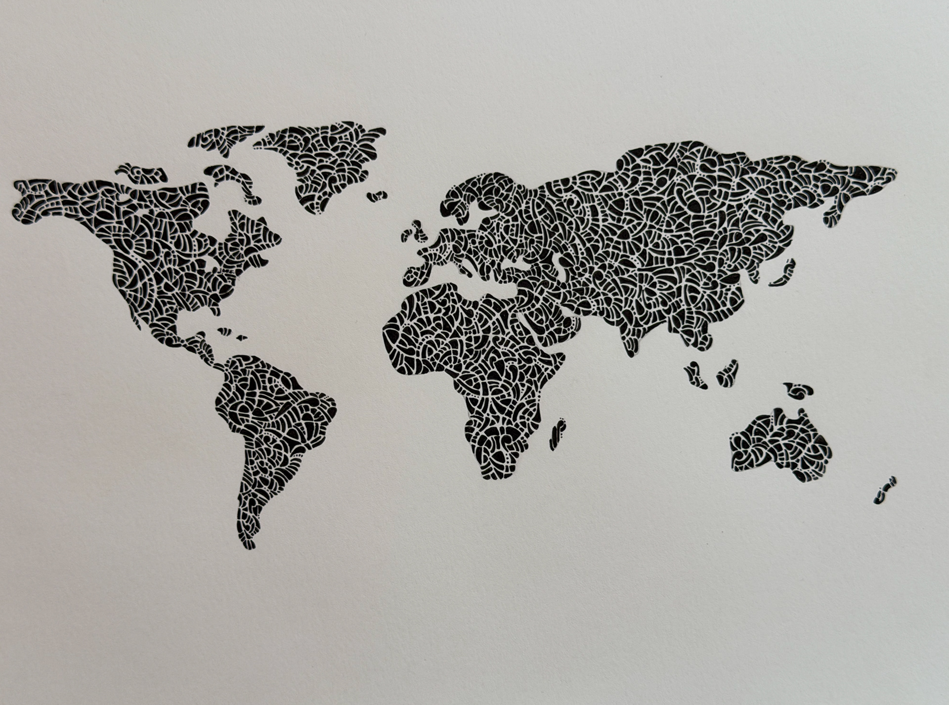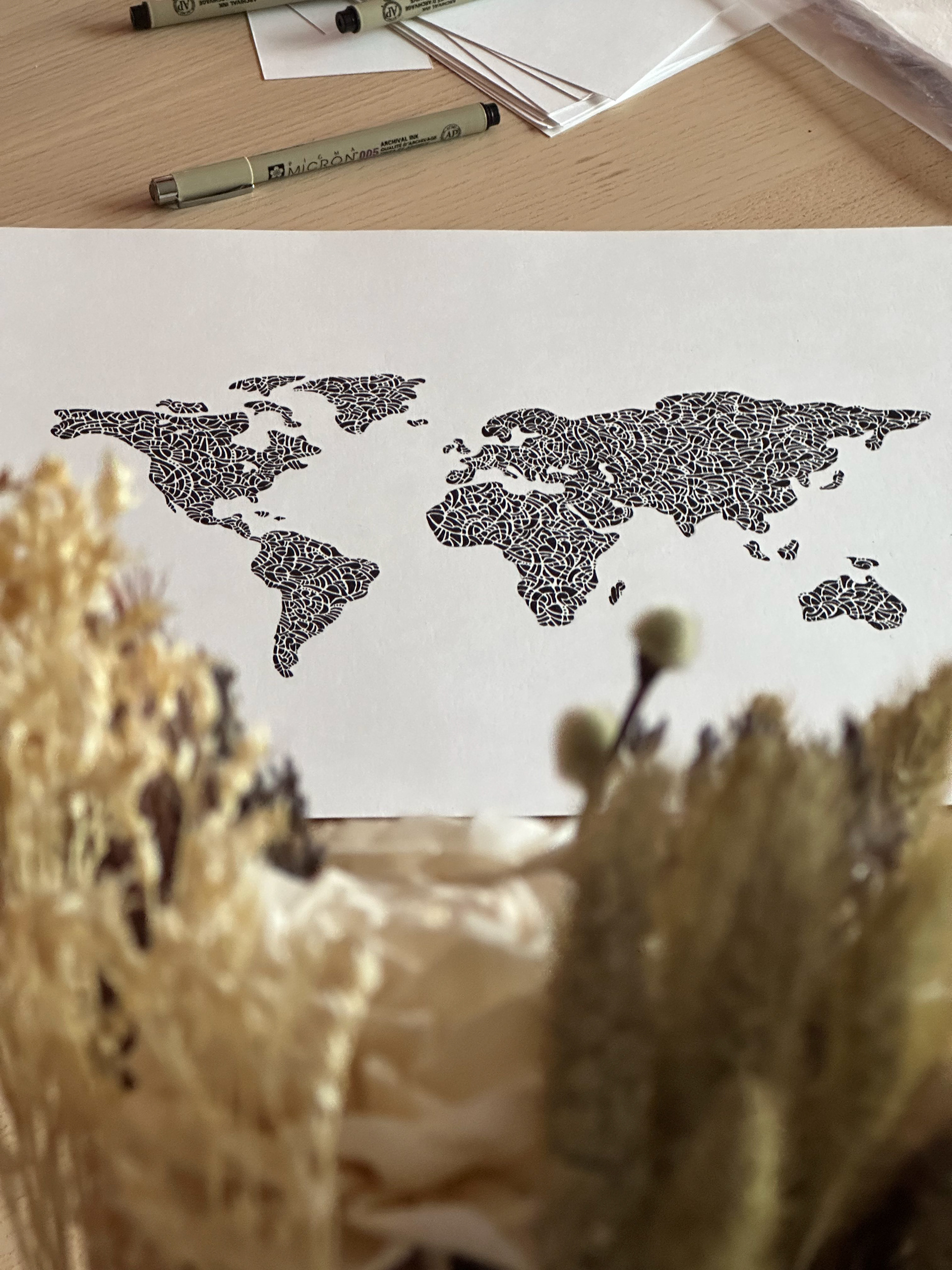 Abstract forms ripple across familiar contours, transforming the world into a network of patterns, movement, and energy. Each shape and detail evokes connection, rhythm, and the invisible forces that link places and people. The work is a meditation on scale and perspective, inviting reflection on the emotional currents that traverse borders, cultures, and landscapes, uniting the global and the intimate in a single visual experience.